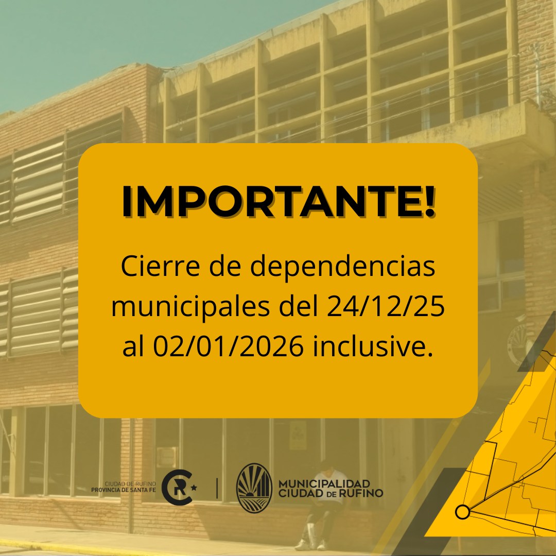 La Municipalidad de Rufino informa que, a través del Decreto Nº 176/2025 se dispone el cierre de las dependencias municipales durante el periodo comprendido entre el 24 de diciembre de 2025 y el 2 de enero de 2026, excepto aquellas áreas que deban garantizar servicios esenciales.
