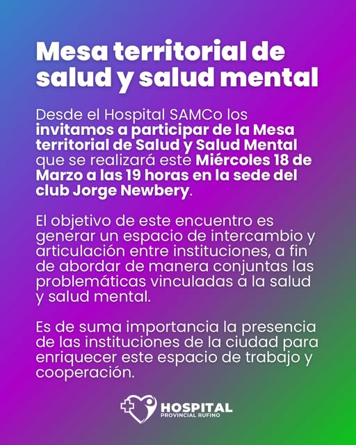 El Hospital SAMCo de Rufino invita a toda la comunidad y a las instituciones locales a participar de una nueva Mesa Territorial de Salud y Salud Mental, un espacio pensado para el diálogo y el trabajo conjunto.