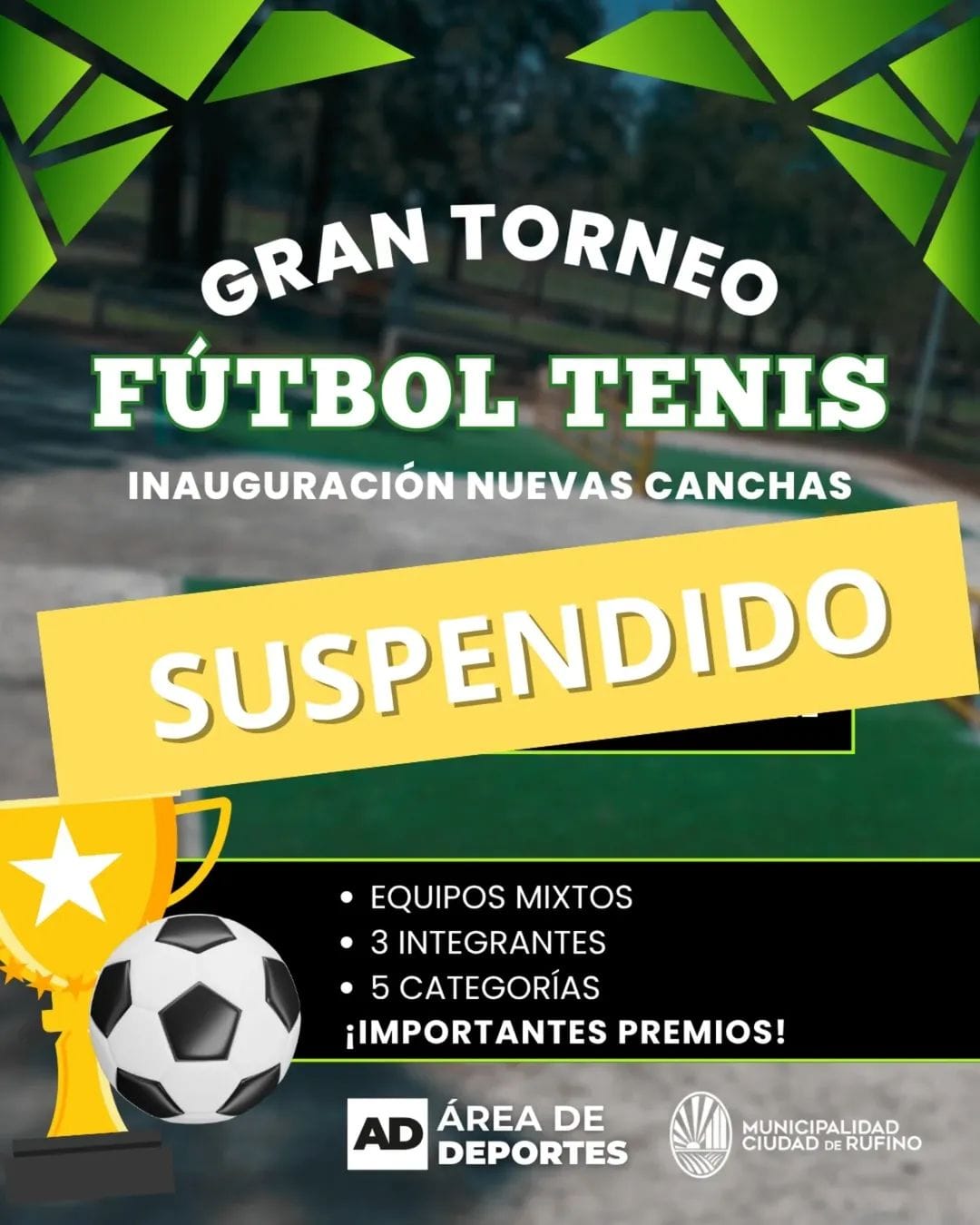 Debido a las condiciones climáticas anunciadas para el día sábado, queda suspendido el torneo de fútbol tenis.