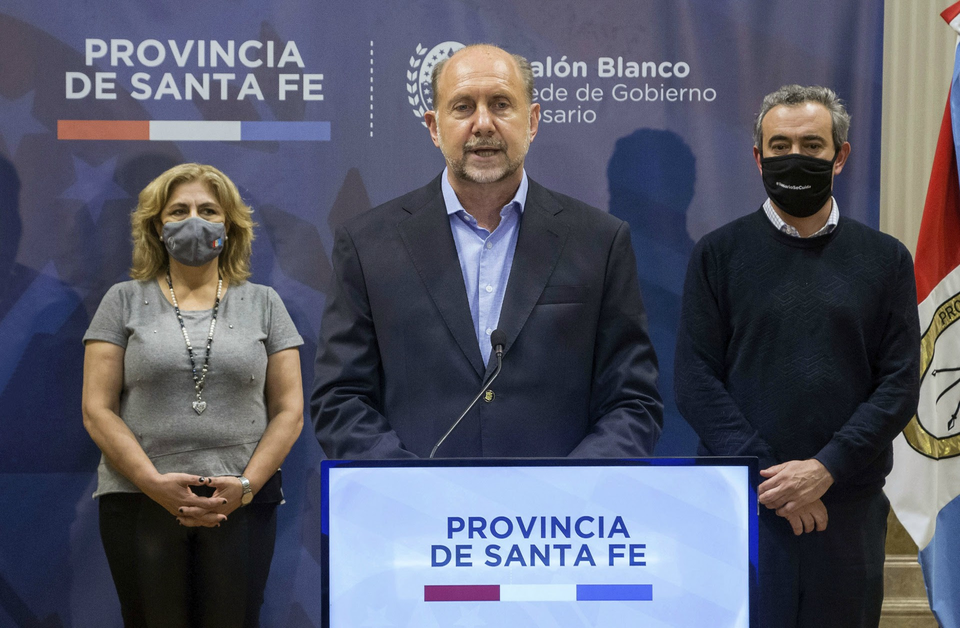 El gobernador Omar Perotti, junto a la ministra de Salud, Sonia Martorano, y el intendente de Rosario, Pablo Javkin, anunciaron este miércoles nuevas disposiciones y medidas en torno a la pandemia Covid-19, luego de registrarse en los últimos días un ascenso en la curva de contagios.