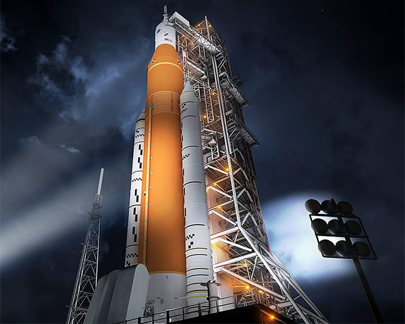 Concepto artístico del cohete SLS y la nave Orión. Image Credit: NASA