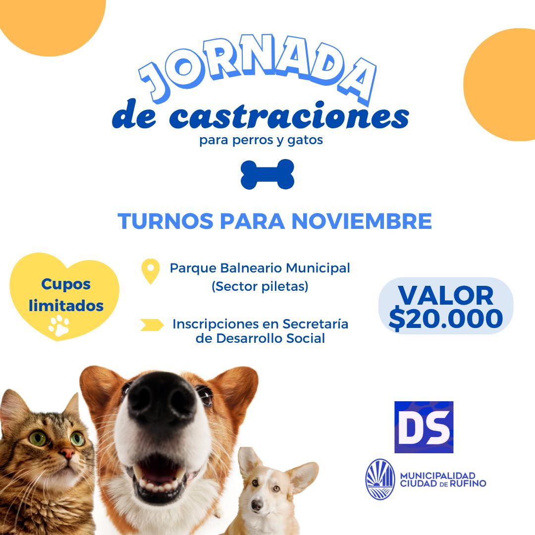 Ya podés pedir tu turno para la nueva jornada de castraciones que se realizará en noviembre en el Parque Balneario Municipal.