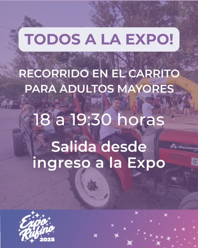 Además, hoy de 18 a 19:30, estará disponible en el ingreso por Italia y Rosa Boussy el carrito para trasladar a adultos mayores, un servicio pensado para facilitar su recorrido por el predio y asegurar que todos puedan disfrutar de la Expo Rufino 2025.