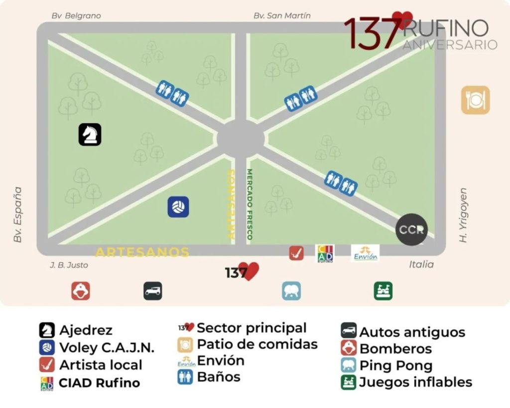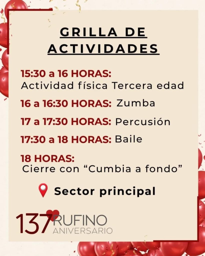 Te compartimos la grilla de actividades y ubicación de las propuestas que tendrá el gran festejo del cumple de Rufino.