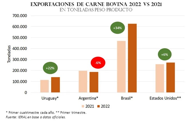 Si bien las exportaciones de carne vacuna aportaron 30,5% más de dólares en el primer cuatrimestre de 2022 que en igual período de 2021, la Argentina fue el único de los países productores que son exportadores importantes que colocó menos volúmenes que un año atrás.