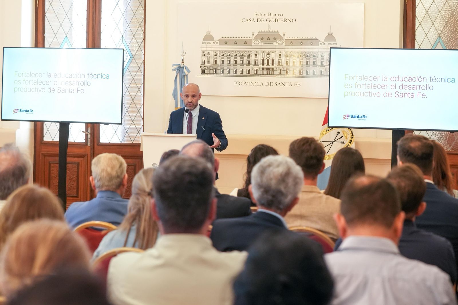 El gobernador Maximiliano Pullaro presentó el Fondo Provincial de Educación Técnica, una herramienta destinada a financiar proyectos educativos en las 172 escuelas técnicas públicas y privadas del sistema santafesino. El acto se realizó este miércoles en el Salón Blanco de la Casa de Gobierno, en la ciudad de Santa Fe, con la participación de los ministros de Educación, José Goity; de Desarrollo Productivo, Gustavo Puccini; y del secretario general de la Asociación del Magisterio de Enseñanza Técnica (AMET), Ernesto Cepeda.