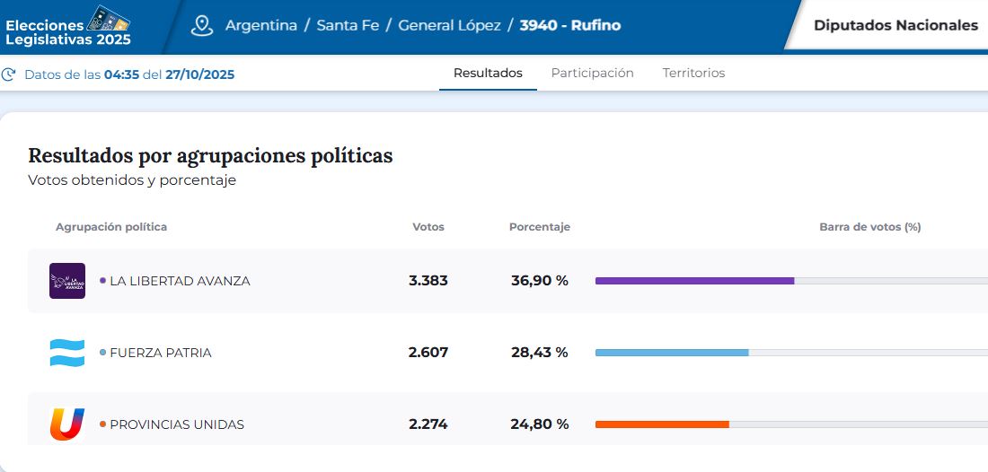 En cambio, Provincias Unidas mostró una mejor performance local (24,8 % en Rufino frente a cerca del 18 % provincial), lo que sugiere un electorado con una distribución más equilibrada entre las tres principales fuerzas.