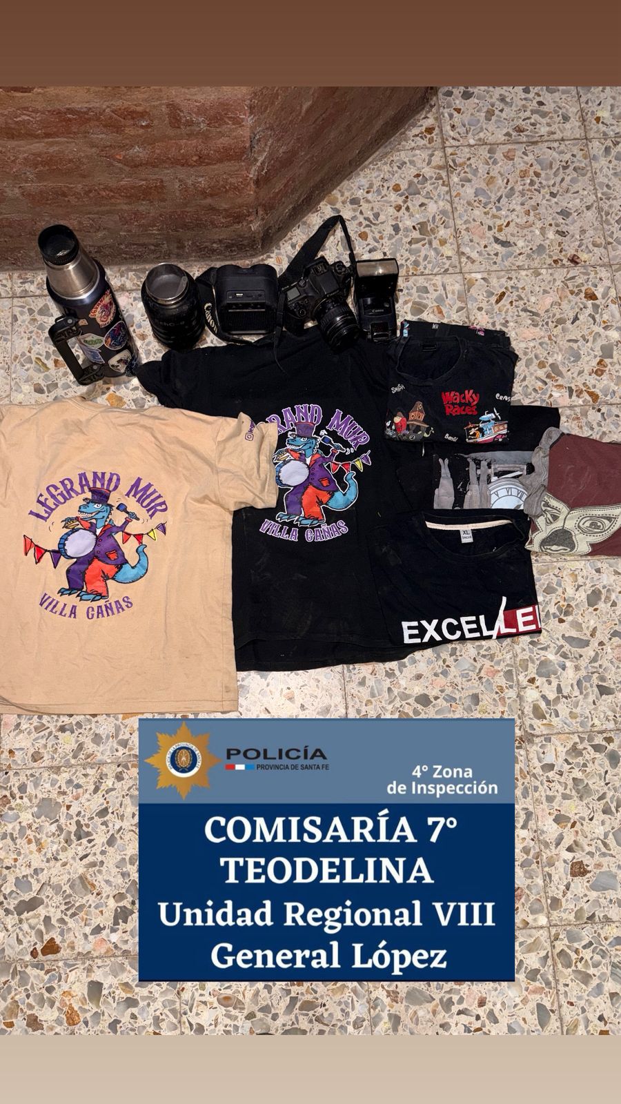 Teodelina. El procedimiento se realizó en el marco de una causa por robo ocurrido el 15 de febrero de 2026 en Teodelina, es por ello que la policía realizo un allanamiento en un domicilio de calle B. Martínez, entre Mitre y C. Gaggieri, donde se procedió al secuestro de un termo azul marca Stanley, un termo negro tipo botella, una remera, un parlante y equipos de telefonía celular.