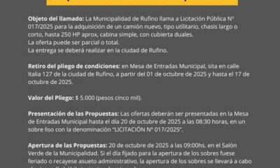 - Presentaciones: Oficina de Compras. Av. Cobo 349, RUFINO, o mediante email a la