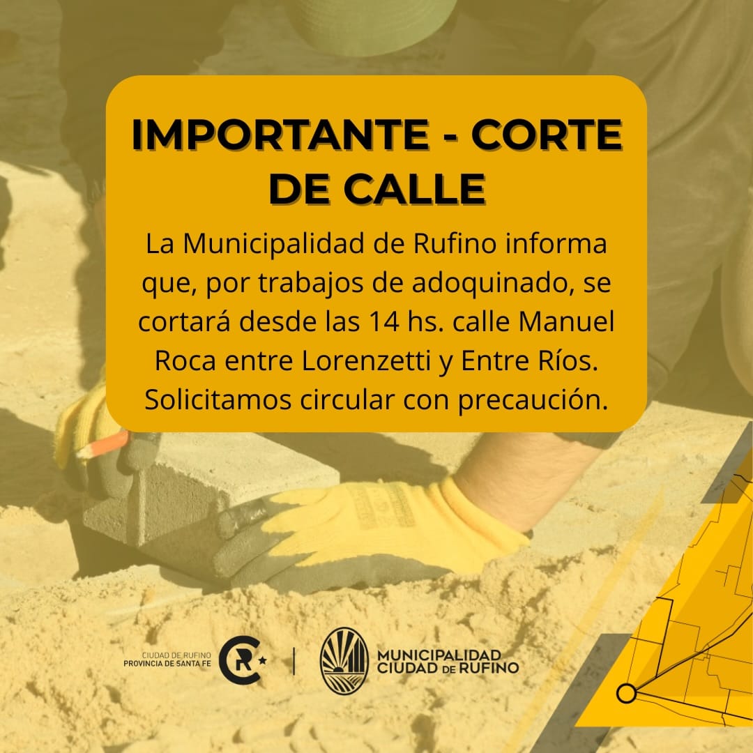 La Municipalidad de Rufino informó que este des hoy a partir de las 14:00 horas, se realizó un corte de tránsito debido a trabajos de adoquinado.