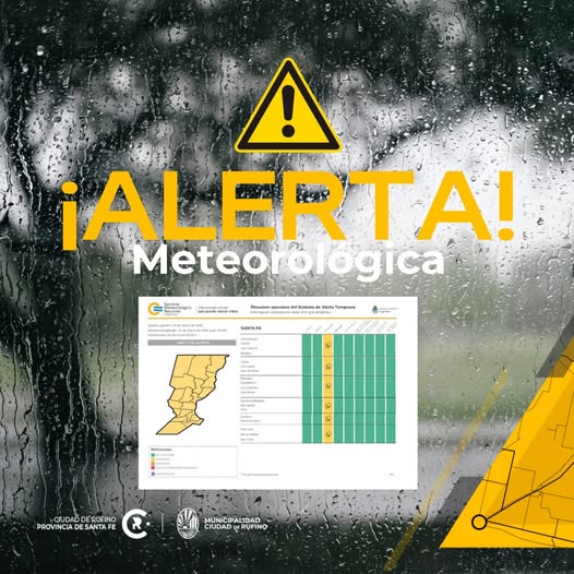 La Municipalidad de Rufino informa que rige un alerta amarilla por tormentas fuertes para la provincia. Las mismas comenzarían a presentarse esta noche.