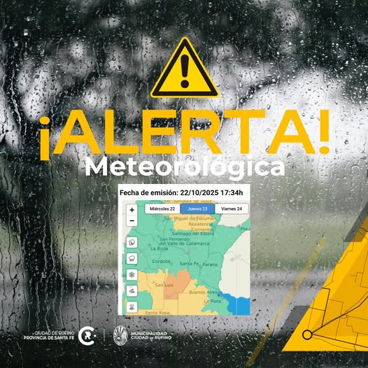 La Municipalidad de Rufino informa que rige un alerta amarilla por tormentas fuertes para el sur de la provincia. Las mismas comenzarían a presentarse este jueves y se agudizarían el viernes.