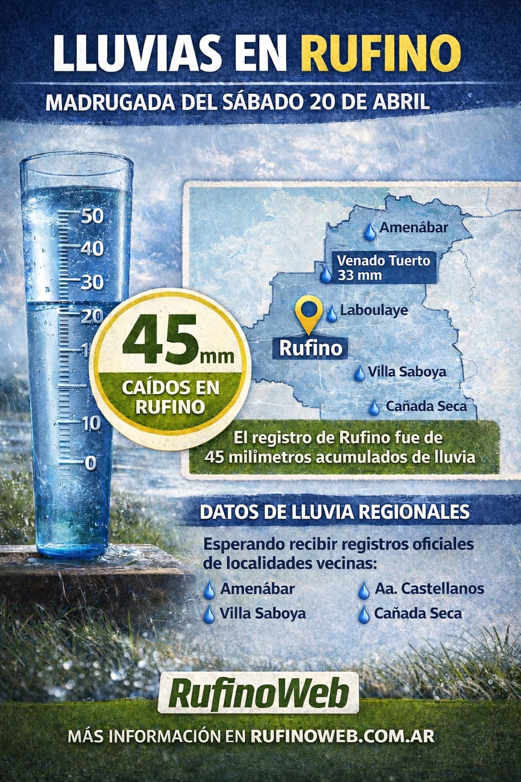 Según datos aportados por la Estación Meteorológica Rufino, se registraron 45 milímetros acumulados, producto de lluvias constantes que comenzaron pasada la medianoche y se extendieron hasta primeras horas de la mañana.
