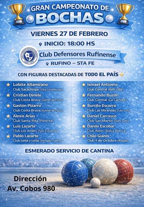 Rufino se prepara para vivir un evento deportivo de primer nivel. El Club Defensores será sede de un Gran Campeonato de Bochas que reunirá a destacadas figuras de todo el país.
