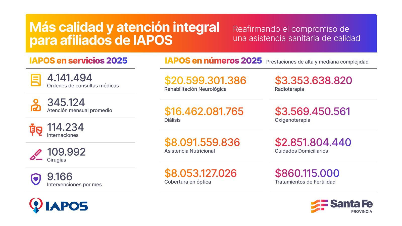 Durante el año 2025, el Instituto Autárquico Provincial de la Obra Social (Iapos) aseguró una cobertura integral de salud para sus afiliados, alcanzando un total de 4.141.494 órdenes de consultas médicas, lo que representa un promedio mensual de 345.124 atenciones.