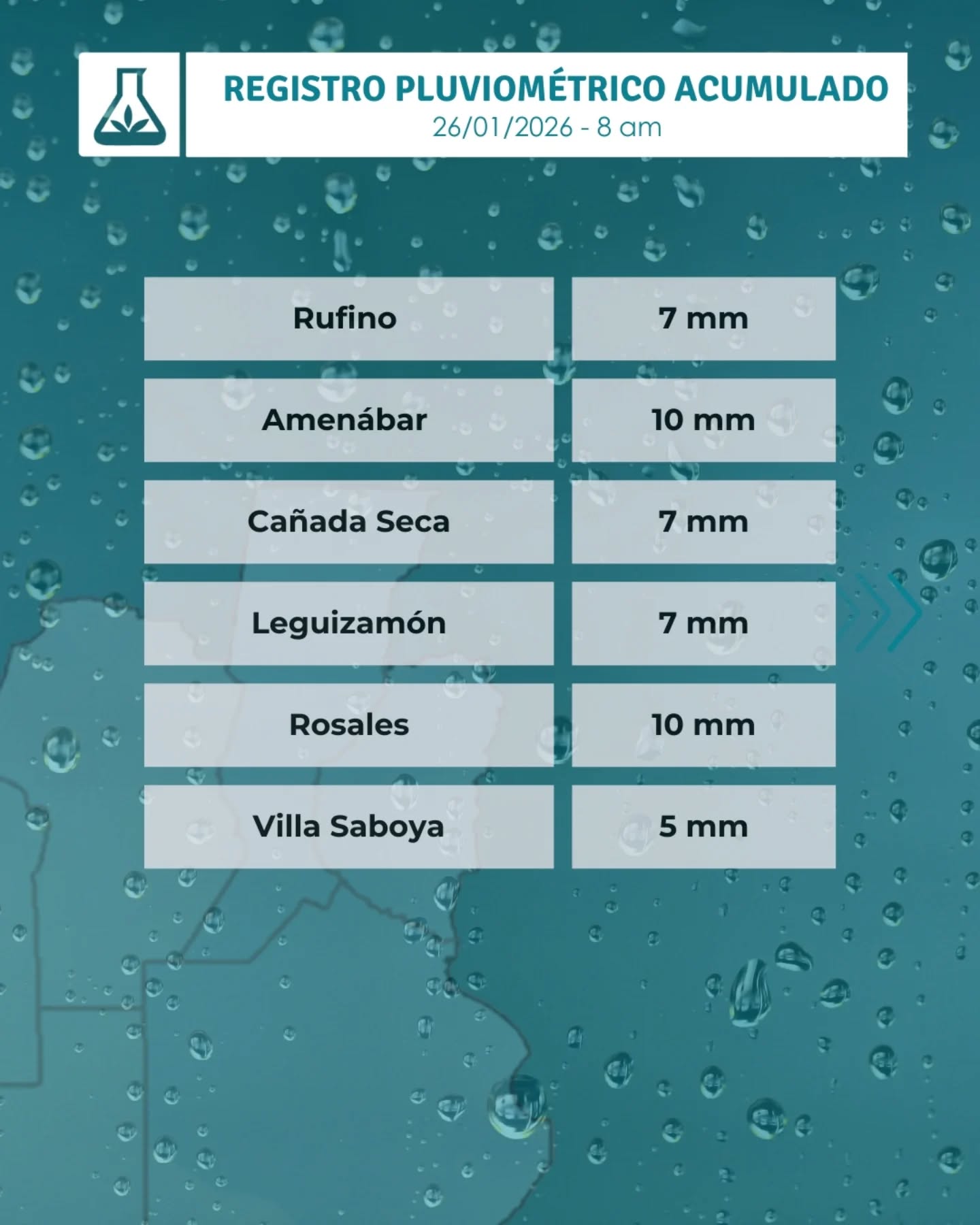 Las precipitaciones fueron generales en toda la zona, beneficiando al sector agropecuario y recargando perfiles de suelo, aunque en algunos sectores se reportaron anegamientos temporarios en caminos rurales.