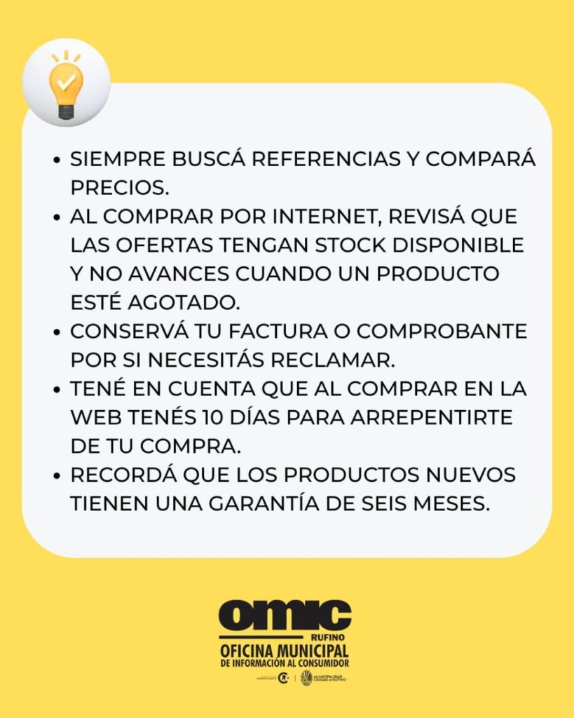 Ante cualquier consulta, acercate a la OMIC Rufino en el Edificio Municipal, comunicate al 428410 o a través de la web en https://autogestion.produccion.gob.ar/consumidores.