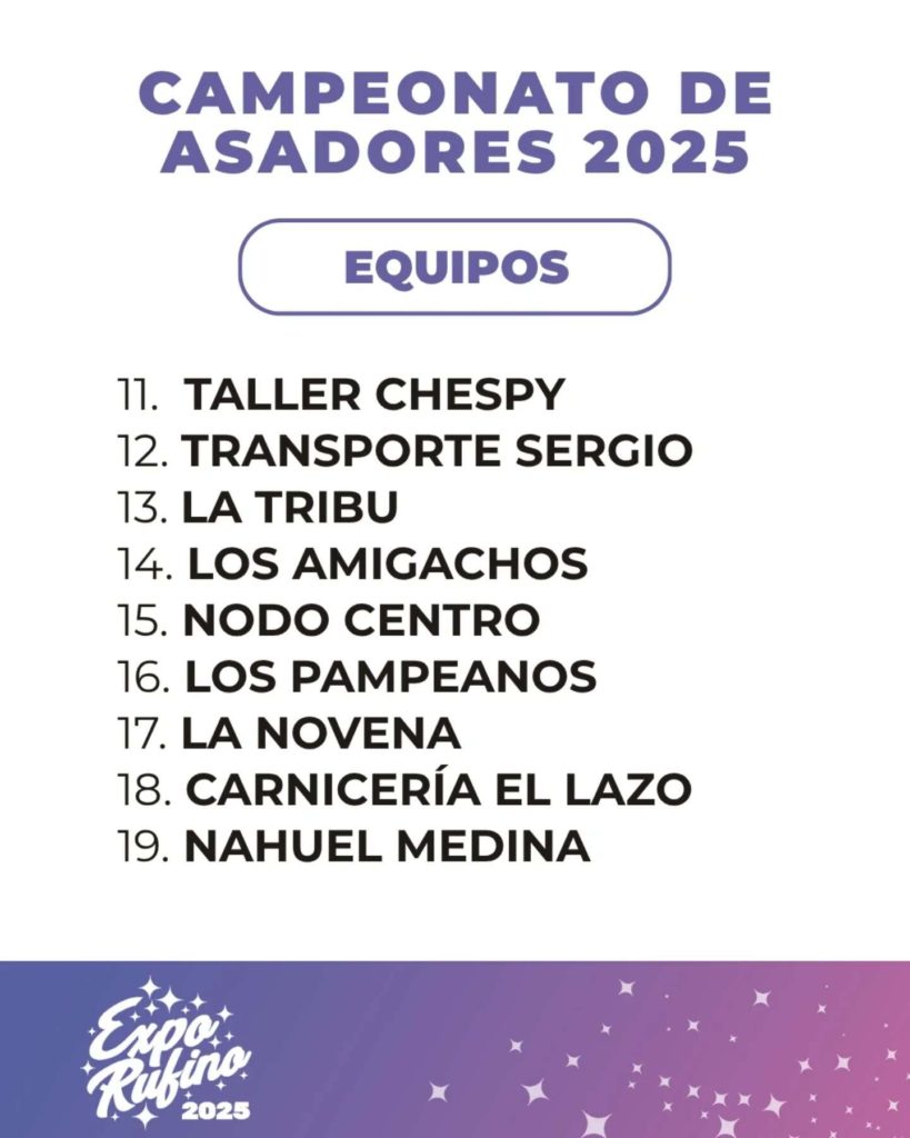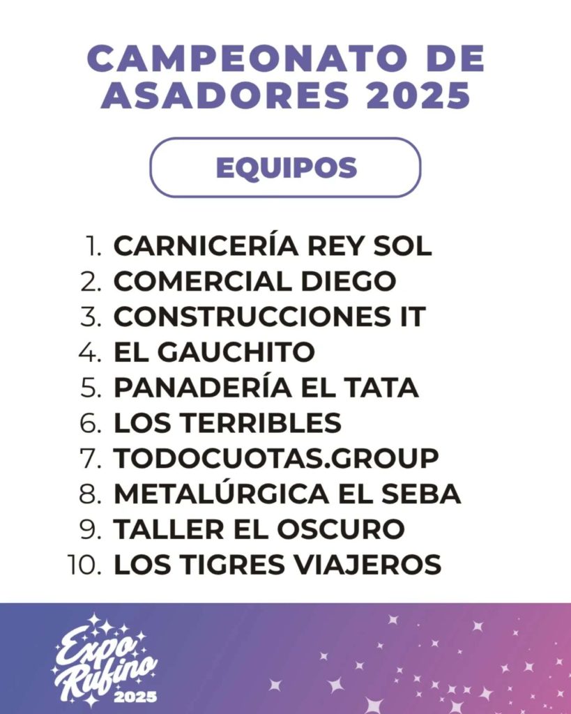 Mañana domingo será el turno del esperado Campeonato de Asadores, una competencia que reúne a los mejores equipos de Rufino y la zona. Te compartimos los grupos participantes que le darán sabor y tradición al evento: