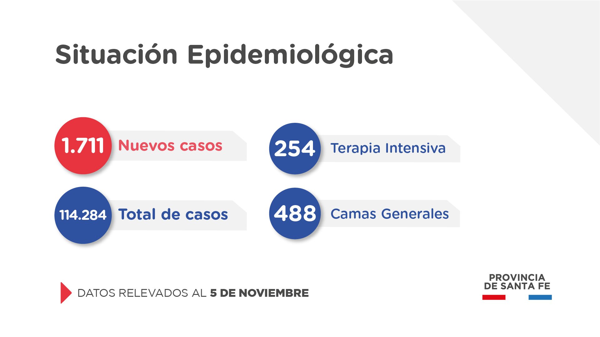 El Ministerio de Salud de Santa Fe, a través de la Dirección Provincial de Epidemiología, informa a la población que en el día de la fecha se han confirmado 1.711 casos nuevos de COVID-19, en el territorio provincial.