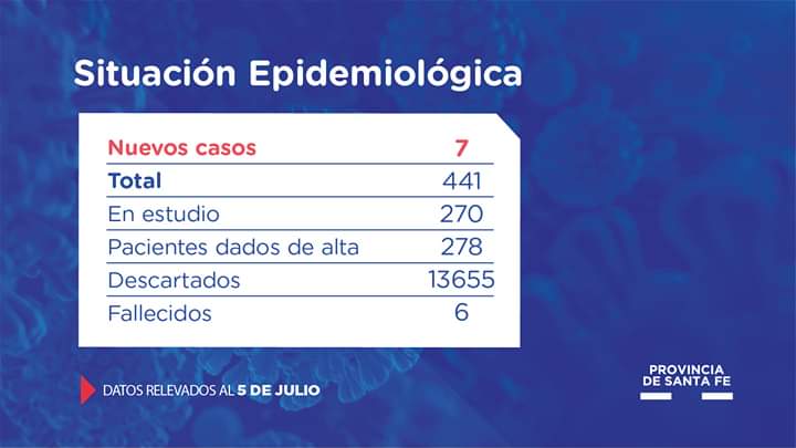 El Ministerio de Salud de Santa Fe, a través de la Dirección Provincial de Epidemiología, informa a la población que en el día de la fecha se han confirmado 7 casos nuevos de COVID-19, en el territorio provincial.