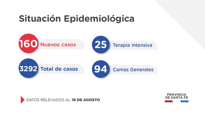 El Ministerio de Salud de Santa Fe, a través de la Dirección Provincial de Epidemiología, informa a la población que en el día de la fecha se han confirmado 160 casos nuevos de COVID-19, en el territorio provincial.