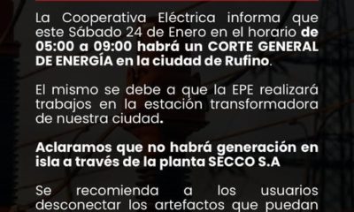 La Cooperativa Eléctrica de Rufino informó que este sábado 24 de enero se realizará un corte general de energía eléctrica en la ciudad, en el horario de 05:00 a 09:00 horas.