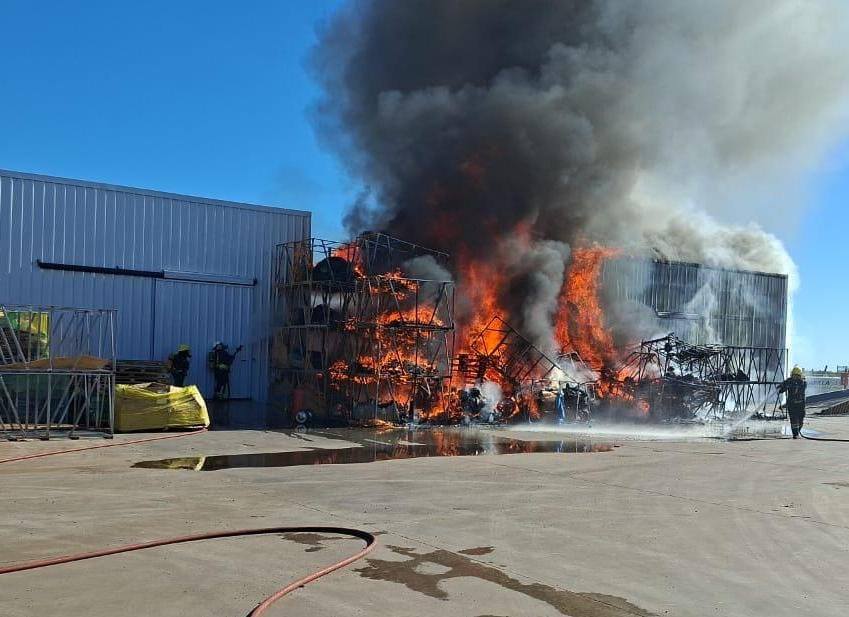 El foco ígneo afectó un sector donde se encontraban tarimas con partes de motos, lindero a un galpón que en su interior contenía tambores de 200 litros con líquidos combustibles, lo que elevó el riesgo de propagación.