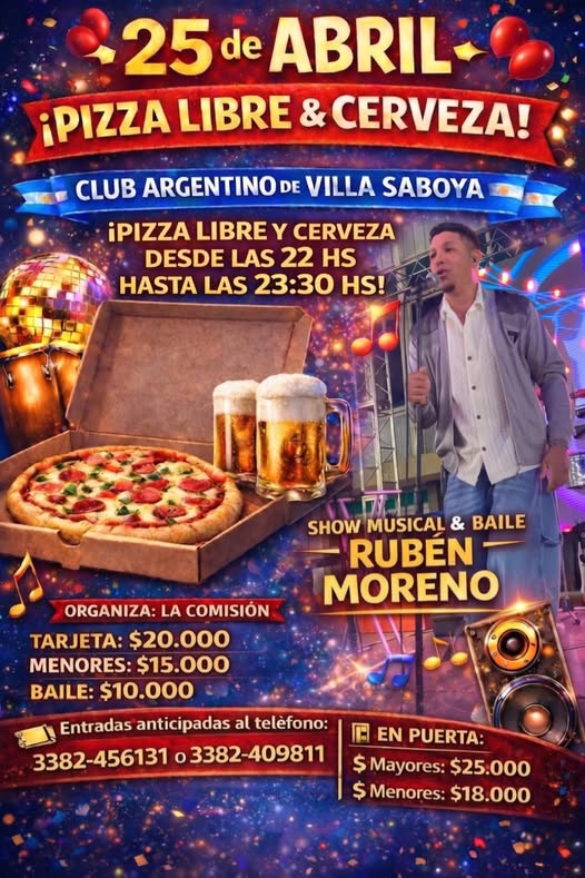 Este sábado 25 de abril, la localidad de Villa Saboya vivirá una noche especial con una propuesta pensada para disfrutar entre amigos y en familia. El evento se llevará a cabo en el Club Argentino de Villa Saboya, donde habrá pizza libre, cerveza, música y baile.