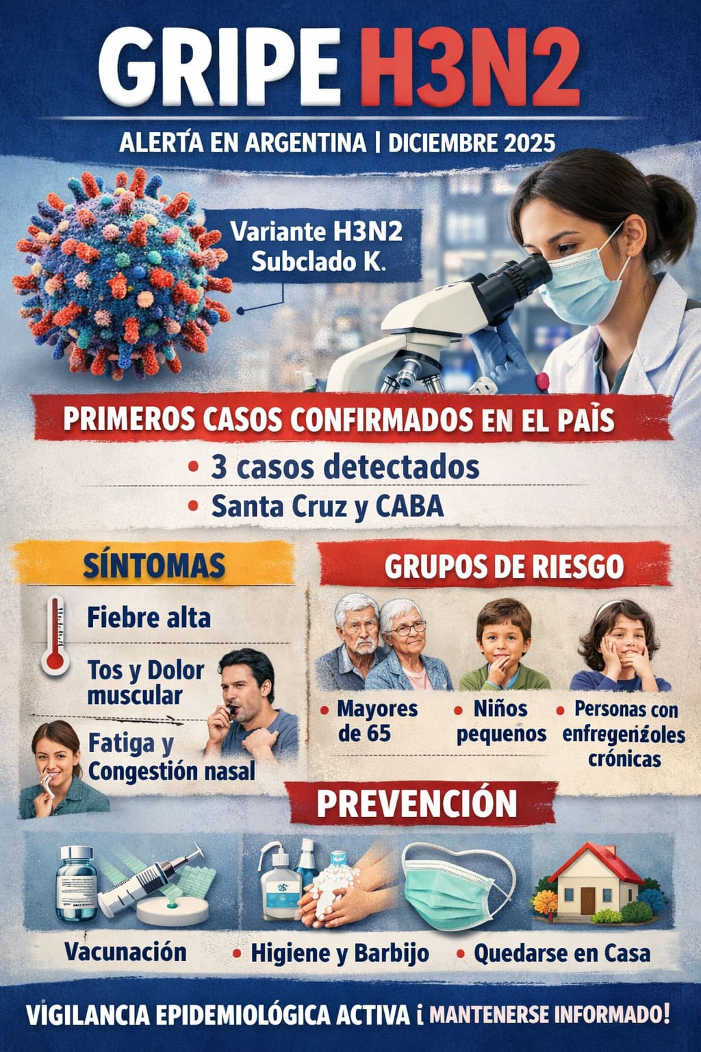 Autoridades del Instituto ANLIS “Dr. Carlos G. Malbrán” confirmaron tres casos de influenza A (H3N2) subclado K en Argentina —dos adolescentes en Santa Cruz y un niño en la Ciudad Autónoma de Buenos Aires— todos con evolución favorable y sin complicaciones graves hasta ahora.